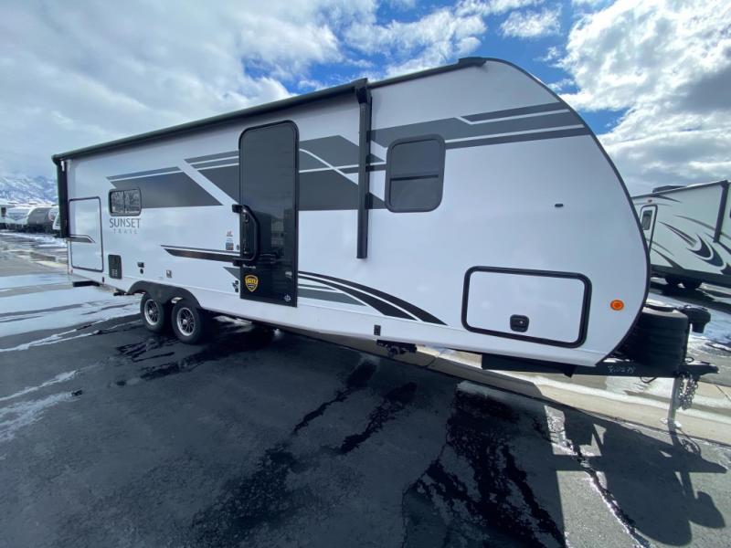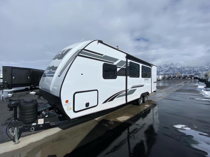 With any Sunset Trailer travel trailer by CrossRoads RV, you will enjoy comfort at every turn! The 5-sided aluminum structure, enclosed underbelly, and HyperDeck flooring provide a durable RV made to last. There is also a power awning with LED lights outdoors, a fiberglass front cap, and a docking station with battery disconnect for easy set-up. Each model includes solid surface kitchen countertops, porcelain toilets, roller shades, and hidden cabinet door hinges to name a few interior comforts!