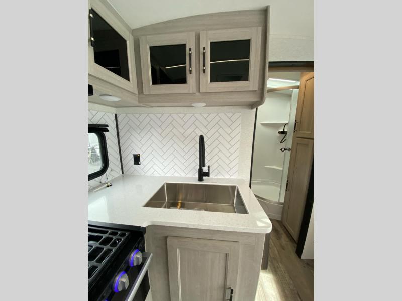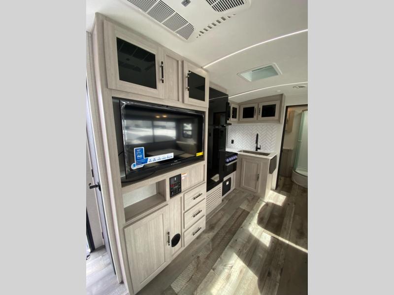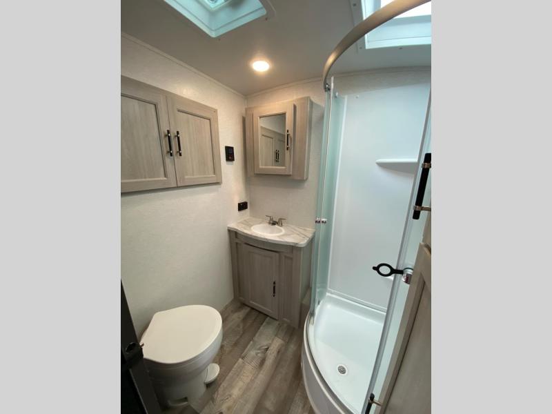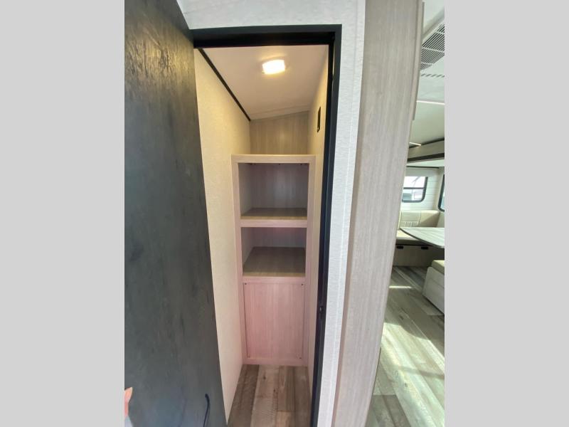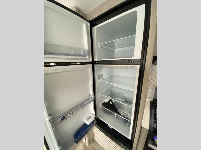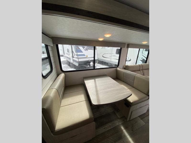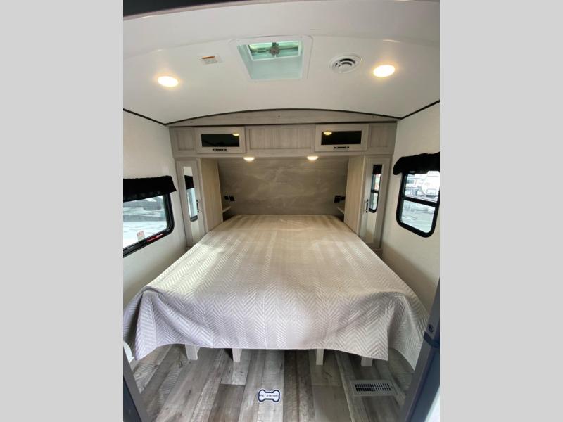 You will love the added interior space you have in this travel trailer thanks to the large slide out in the main living area. Here, you'll enjoy playing cards at the XL booth dinette and relaxing on the tri-fold sofa. Make home-cooked meals on the glass top range or use the exterior camp kitchen. There is even an exterior refrigerator for cold drinks, and the power awning will shade you from the hot summer sun. This model features a full rear bath for added privacy, and the shower skylight will allow natural light in. The front private bedroom includes a king bed, dual wardrobes, plus a shoe storage and pet station for your convenience!