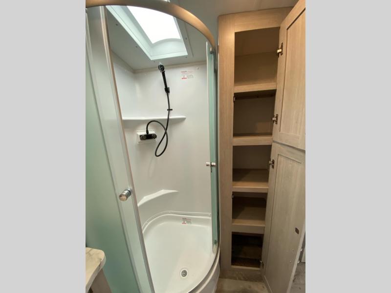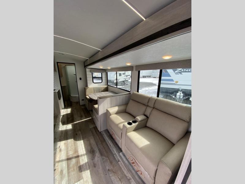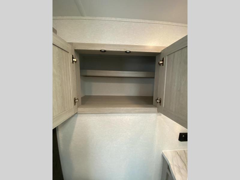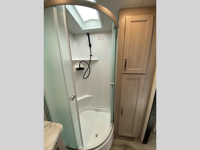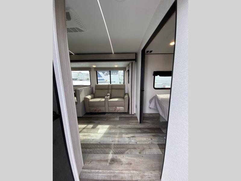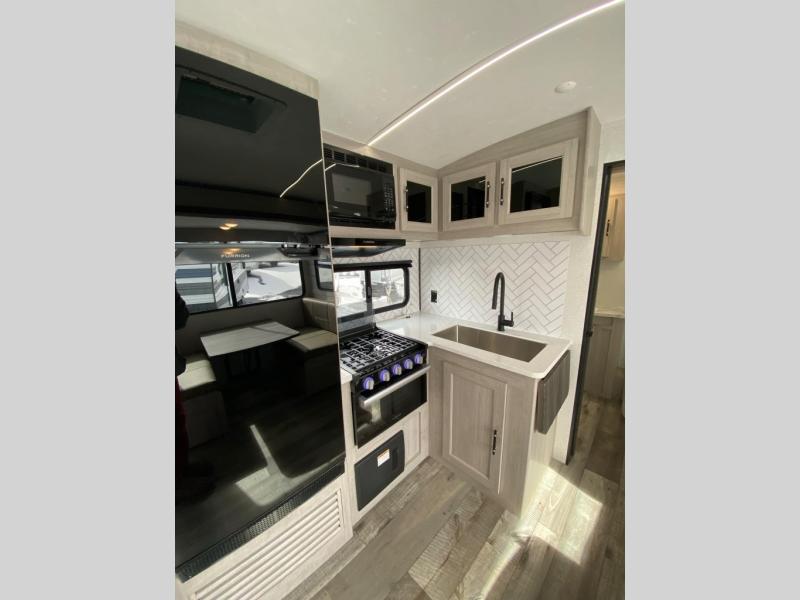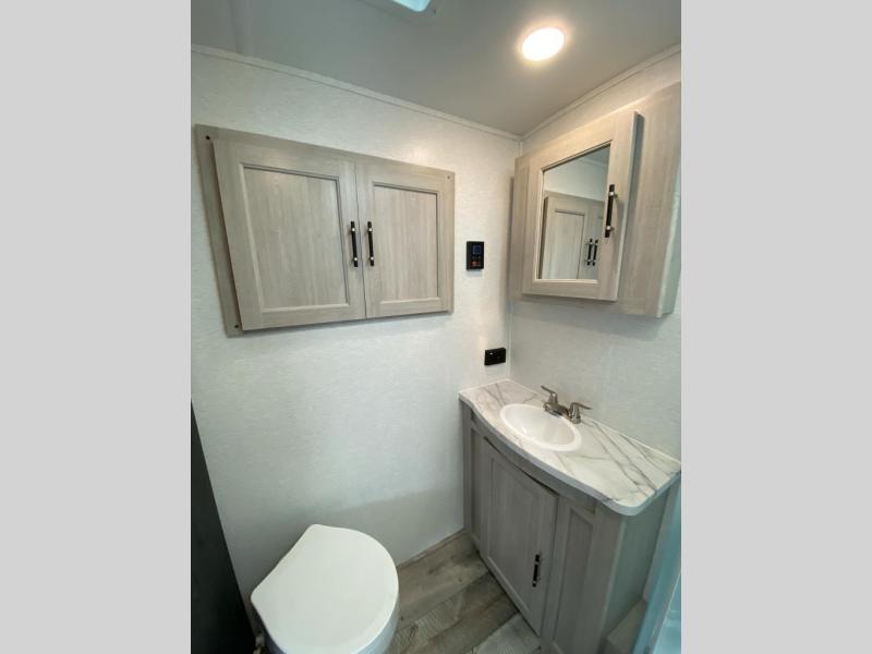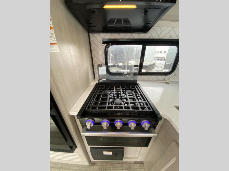 You will love the added interior space you have in this travel trailer thanks to the large slide out in the main living area. Here, you'll enjoy playing cards at the XL booth dinette and relaxing on the tri-fold sofa. Make home-cooked meals on the glass top range or use the exterior camp kitchen. There is even an exterior refrigerator for cold drinks, and the power awning will shade you from the hot summer sun. This model features a full rear bath for added privacy, and the shower skylight will allow natural light in. The front private bedroom includes a king bed, dual wardrobes, plus a shoe storage and pet station for your convenience!