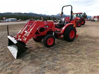 New 34HP KIOTI Compact HST Tractor (Model CK3520H) with KL4030 front loader and quick attach bucket (lift capacity 1830 lbs), 4WD, HST drive transmission, rear PTO with 3 pt lift control, wet disc brakes, power steering, differential lock, foldable ROPS, deluxe seat, LED lights.