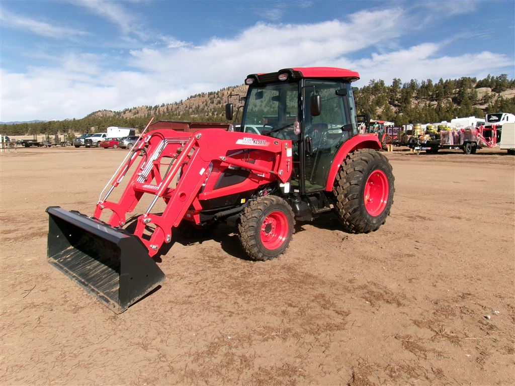 New 57HP Deluxe Cab Tractor (Model NS6010MC) by KIOTI, KL5810 front loader with a quick attach bucket (lift capacity 2620 lbs), 4WD, gear drive transmission, rear PTO with 3 pt lift control (Cat 2), differential lock, wet disc brakes, power steering, set of spring rear hydraulic remote valves, front working lights, AC / Heat, rear window defrost, Bluetooth radio stereo.