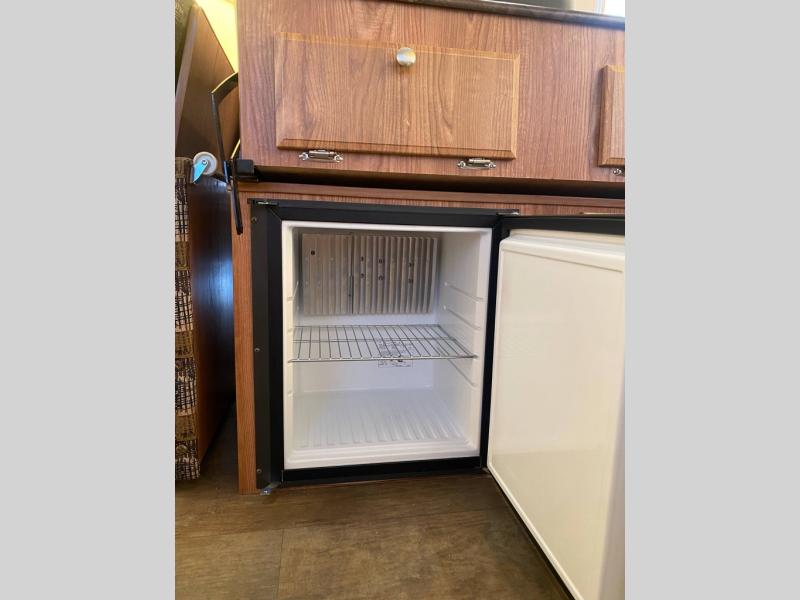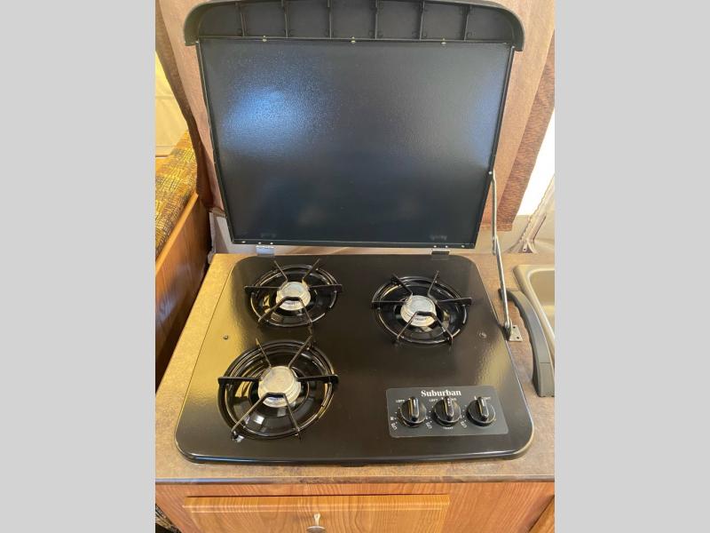 Standard with a range of features, including a fiberglass laminated roof, wood plank flooring, and a 12V electric water pump. It also includes a 2-burner range with a glass cover, residential-style cabinet doors, and USB charging ports.