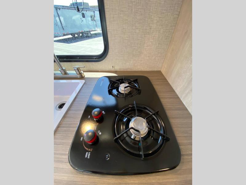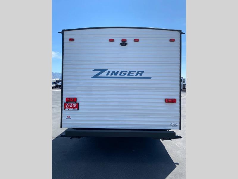 This Zinger Lite travel trailer is perfect for your next family vacation or weekend at the lake with friends. With room for five, this unit gives you the space you need to pack up the kids and the dog and get ready to hit the road! With an RV queen bed and bunk beds, everyone will have a place to sleep. The 38" booth dinette can comfortably hold one to two little ones or an adult guest. Use the two burner range to make a home-cooked meal and easily store your leftovers in the 12V refrigerator. Enjoy extra privacy with a rear corner bath that includes a 30" x 36" shower. This unit features multiple overhead compartments, so bring along the board games and other valuables from home.