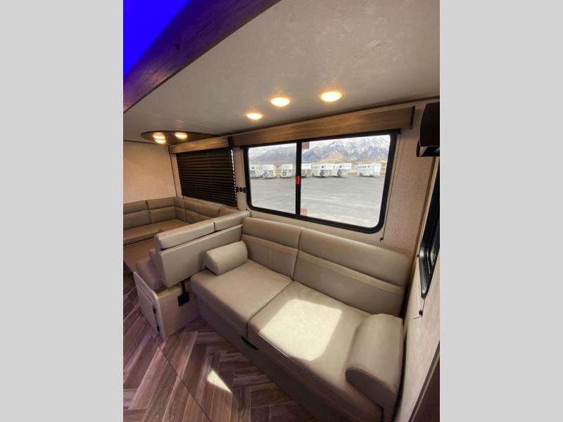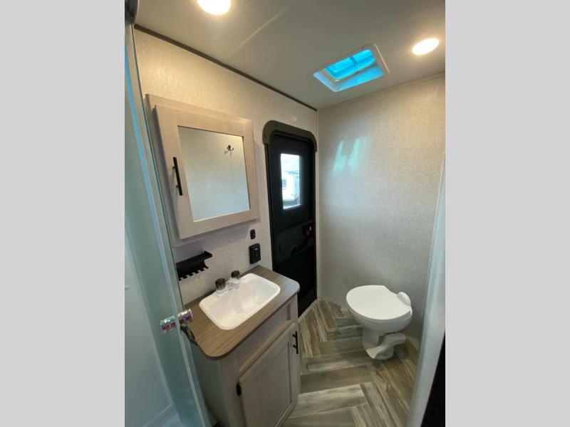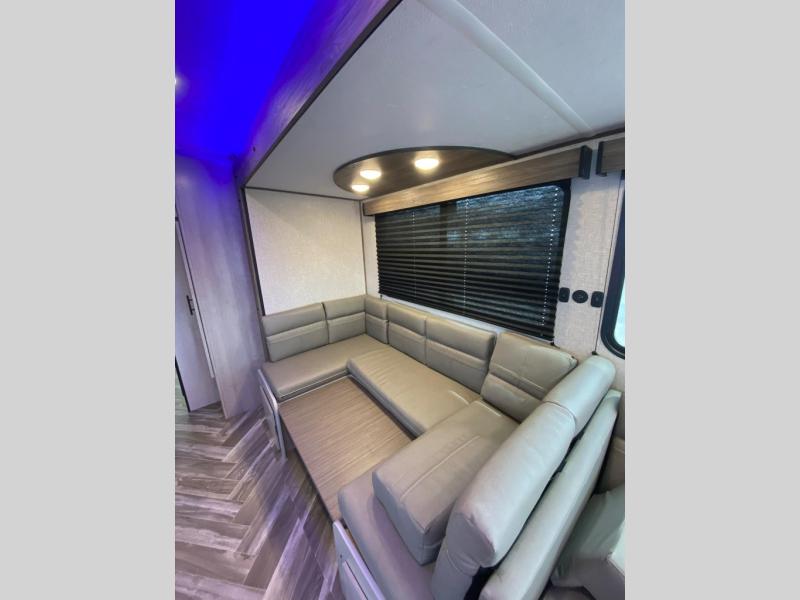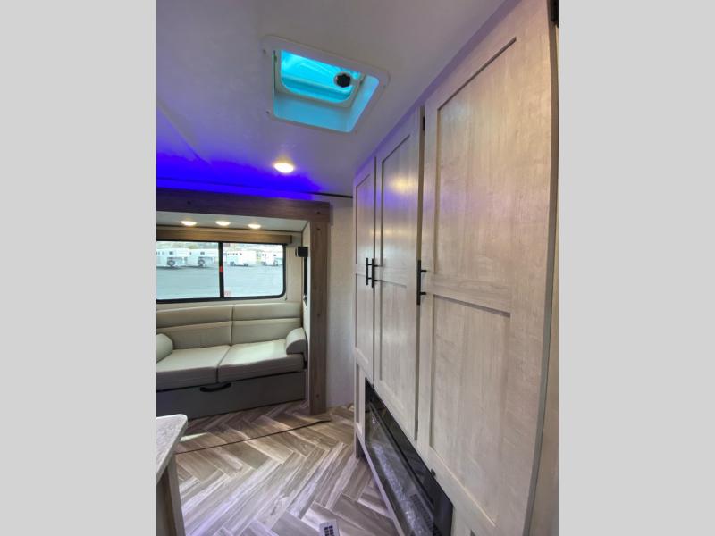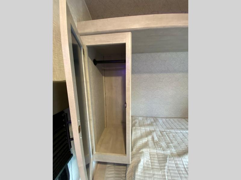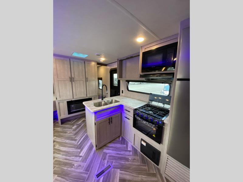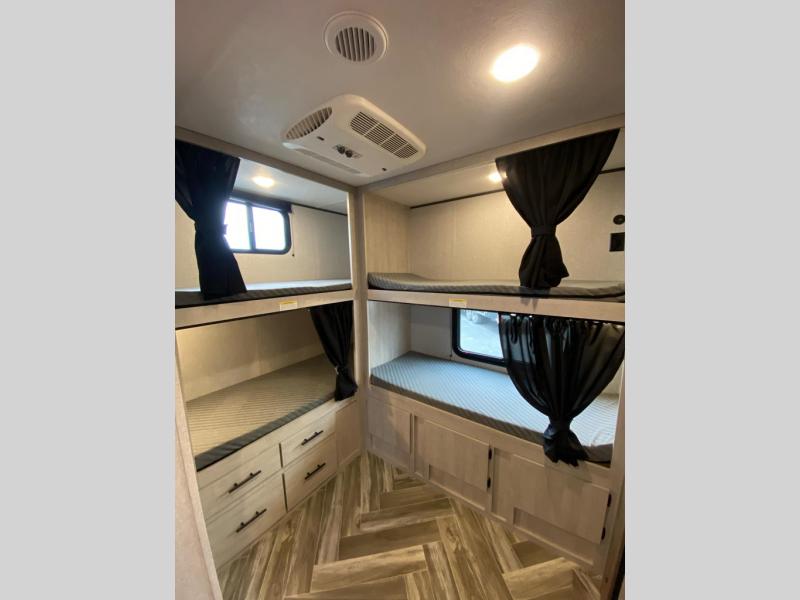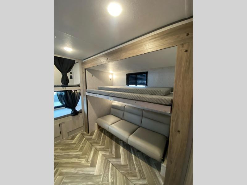 With dual entry doors, you will experience a smooth flow of traffic in and out of this travel trailer! The rear private bunkhouse includes two sets of bunk beds plus a fifth bunk over a jack knife sofa, so your kids can invite a few friends to come along. Across from the full bathroom is a linen closet to keep your towels close by and a U-shaped dinette to enjoy your meals at, play games, and even transform into an extra sleeping space. At night you can either relax on the 60" jackknife sofa by the fireplace or head to the front private bedroom and lie down on the 60" x 74" RV queen bed with closets on either side to keep your clothes looking their best!