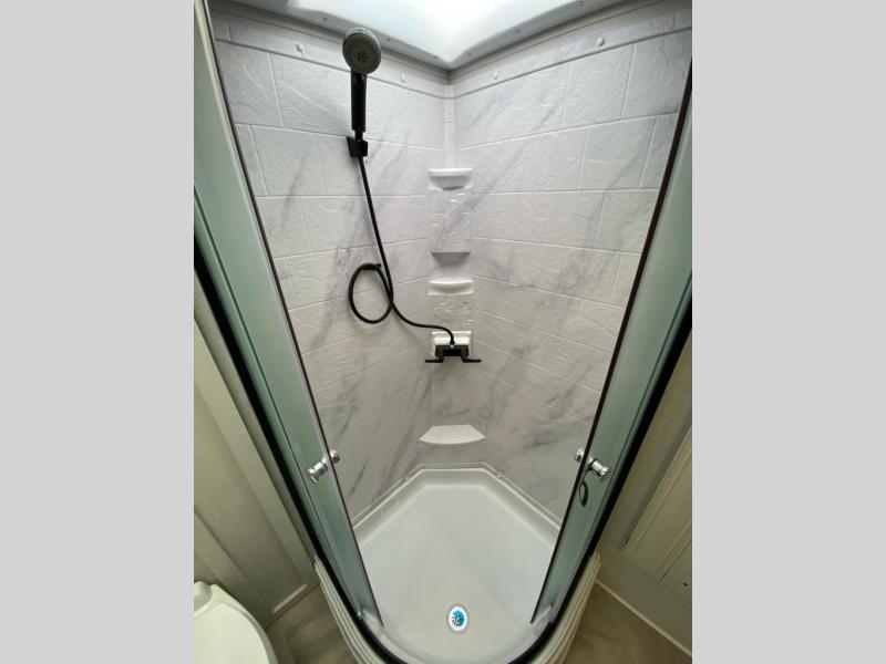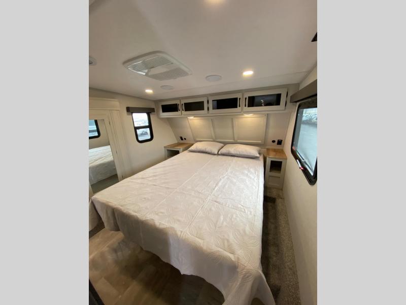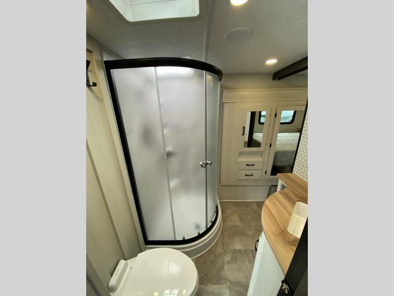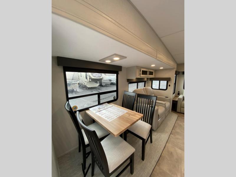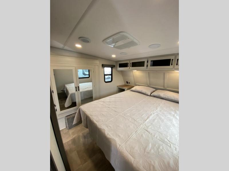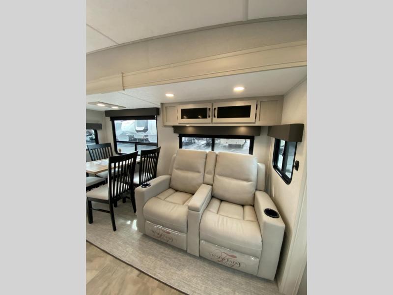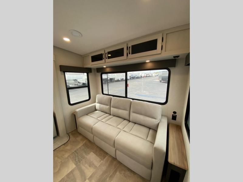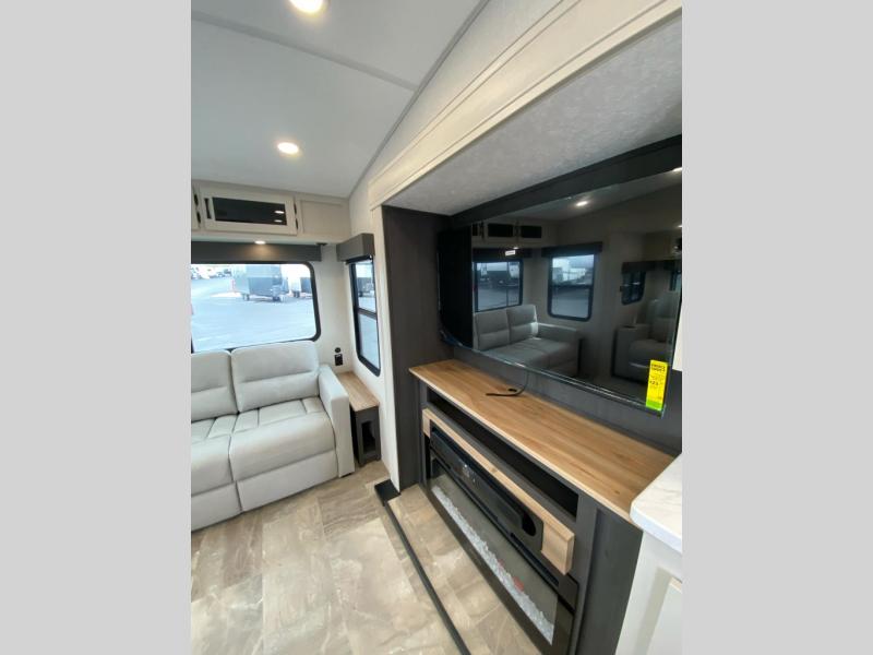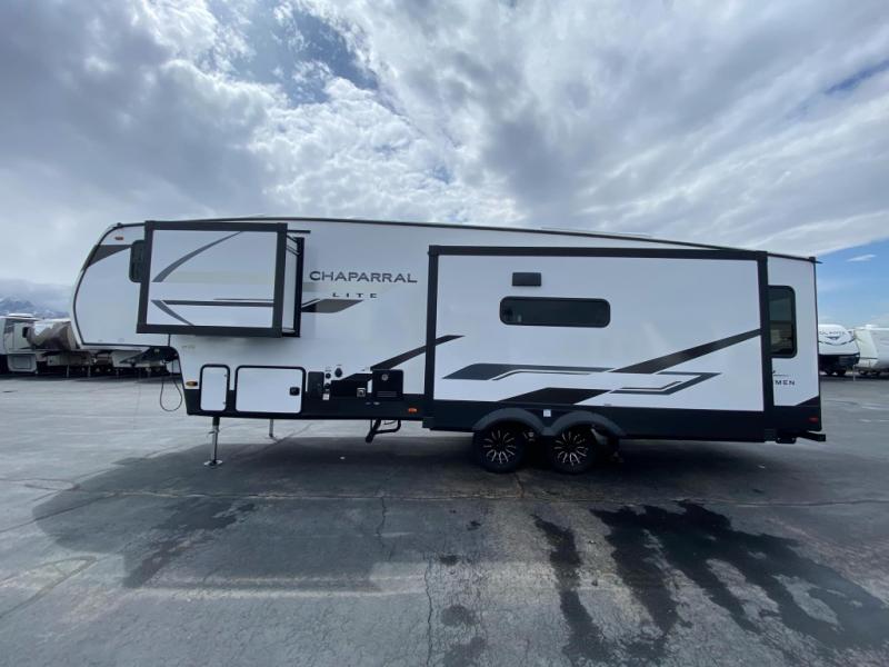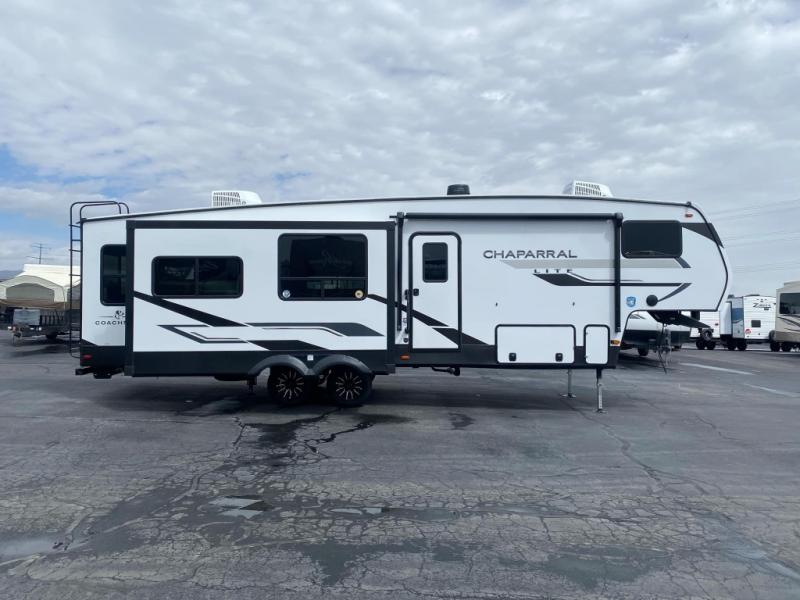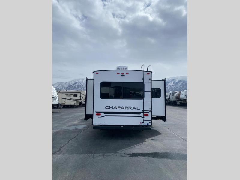 Each Chaparral mid-profile fifth wheel by Coachmen is designed with residential features, loads of storage space, and roomy bedroom suites to make you feel right at home. The durable construction means you can enjoy your RV for years to come. There's 6X double Azdel aluminum cage sidewall system, Weather Shield+ technology, and Tri-Tex powder coated frame technology that will allow you to camp year around. Each model includes a Winegard Air 360+ HDTV/radio dome antenna to help keep you connected as you camp, slow rise blackout roller night shades, a new 16 cu. ft. side-by-side stainless glass 12V refrigerator, and a modern electric fireplace to make your space cozy. There is also a large transom window in the kitchen, a modern high-rise faucet, LED motion sensor lights in the bathroom, plus a full-size shower with glass doors and a seat. Now that's what I call luxury! Choose a Chaparral fifth wheel today!
