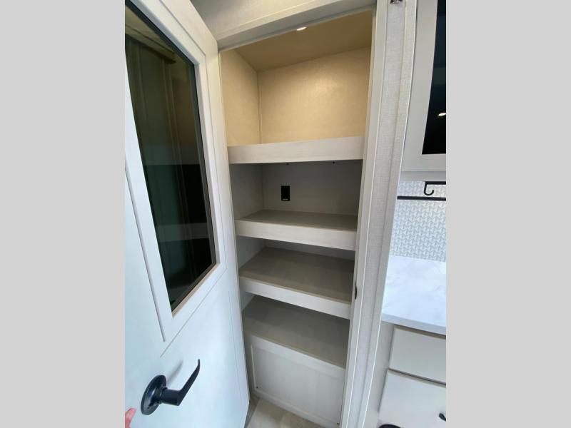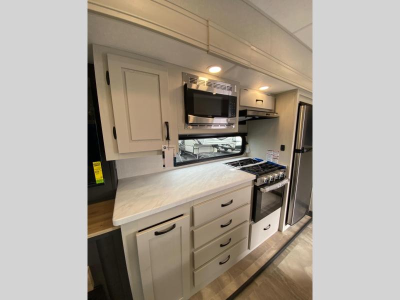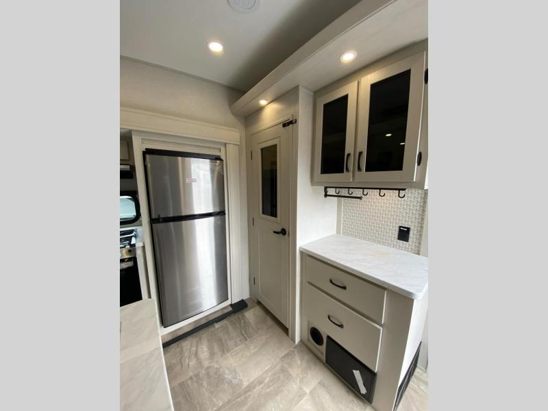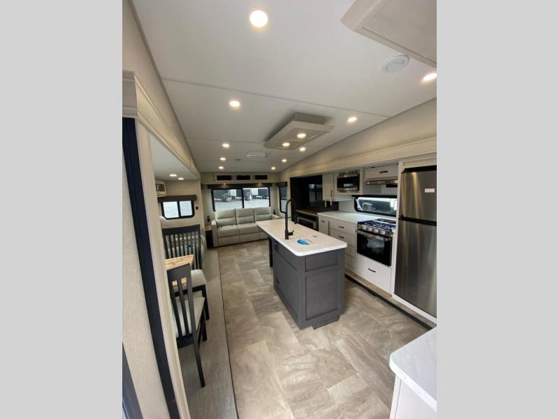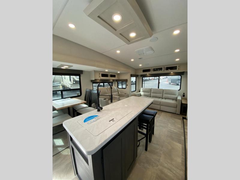 Are you wanting to trade out your busy work weeks for relaxing vacations? This fifth wheel can give you just that! Once you arrive at your destination, set up the 16' power awning with LED lights and enjoy some fresh air before you unpack your bags. The chef can start lunch on the GE Profile 21" oven with a residential cooktop, and there is an island with two barstools if the little ones want to color while they wait on their food. This model also includes a large pantry plus extra counter space with overhead storage for dishes. Everyone can take turns cleaning up in the full bath that includes a spacious shower with a seat and a linen closet to keep clean towels close by. When it's time to call it a night, you'll enjoy the king bed slide out in the front bedroom, while your guests take the rear tri-fold hide-a-bed sofa!