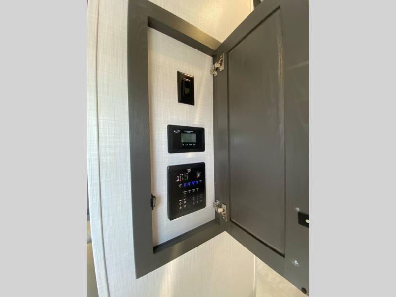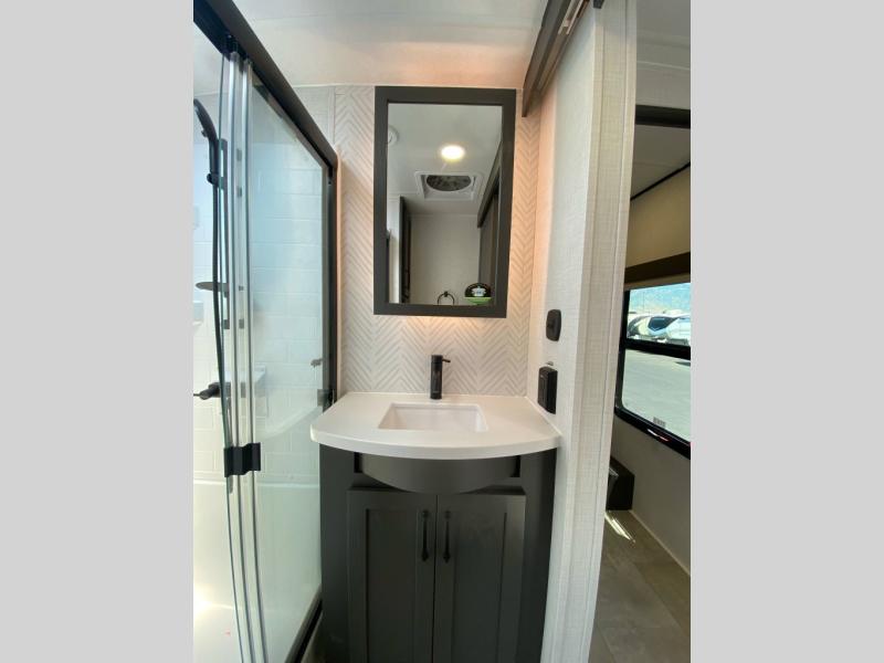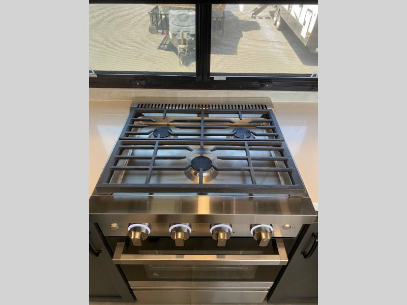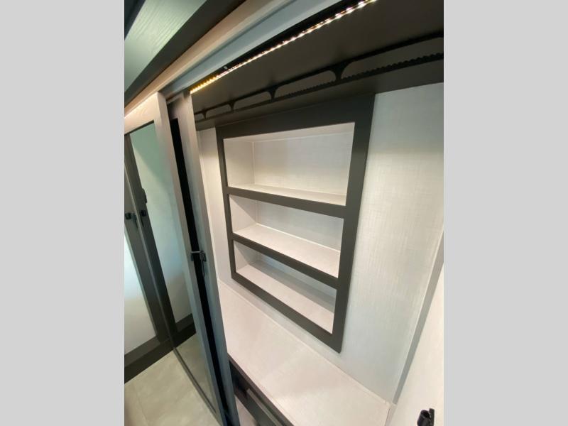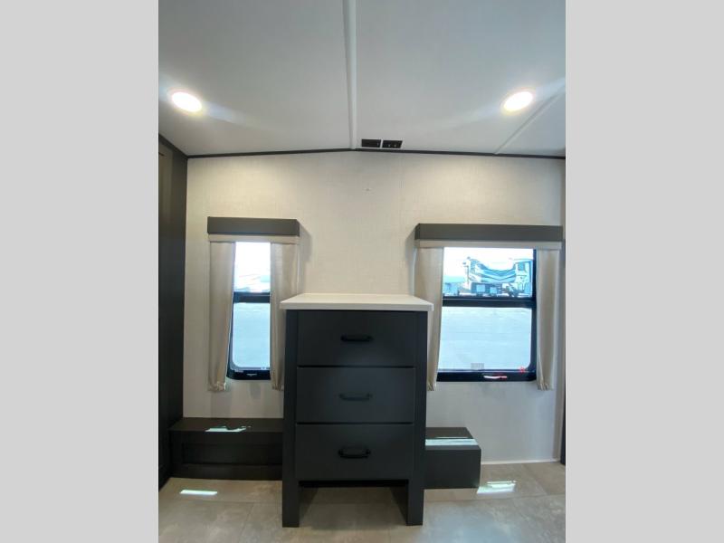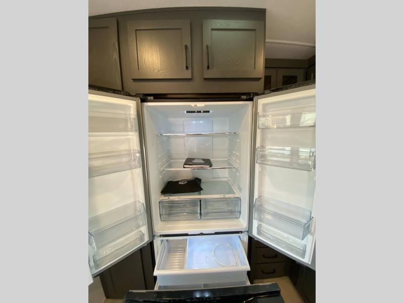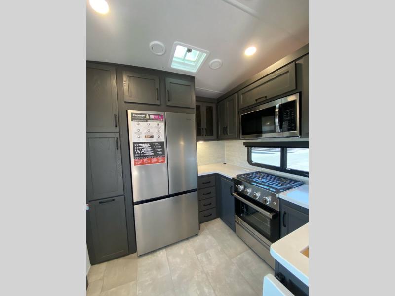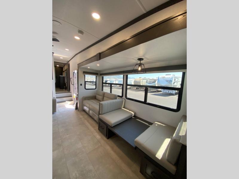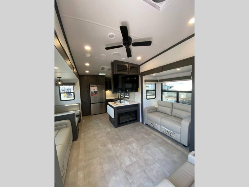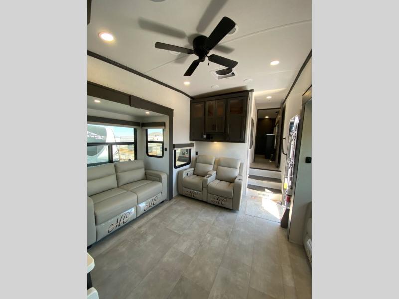 This fifth wheel has everything and then some! The front private bedroom has a queen bed slide with an optional king bed that can replace it and a front wardrobe with washer and dryer prep. Freshen up each morning in the full bathroom featuring a shower with a seat then head to the rear kitchen and scramble up some eggs on the three burner cooktop. You can enjoy your morning coffee and eggs at the 39" dinette. In the middle living area there is a 60" theater seat across from an entertainment center with a fireplace and opposing hide-a-bed sofa slides. You can even a cook outside on the outdoor griddle underneath the 11' awning! There is a second 13' awning over the Solid Step entry and pass-thru storage area.