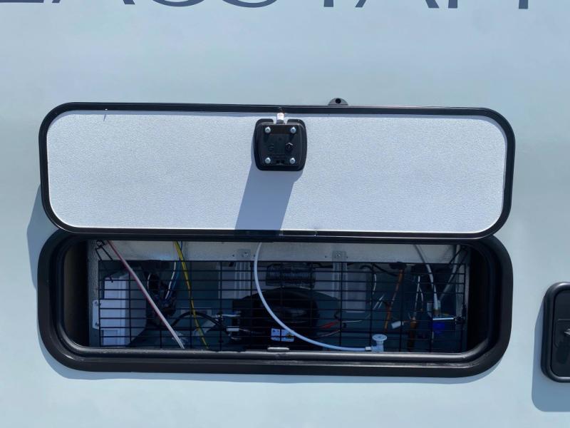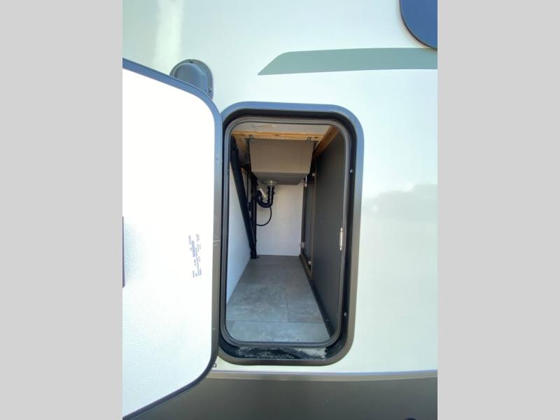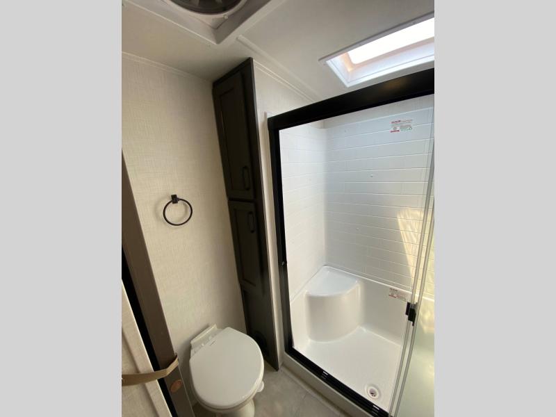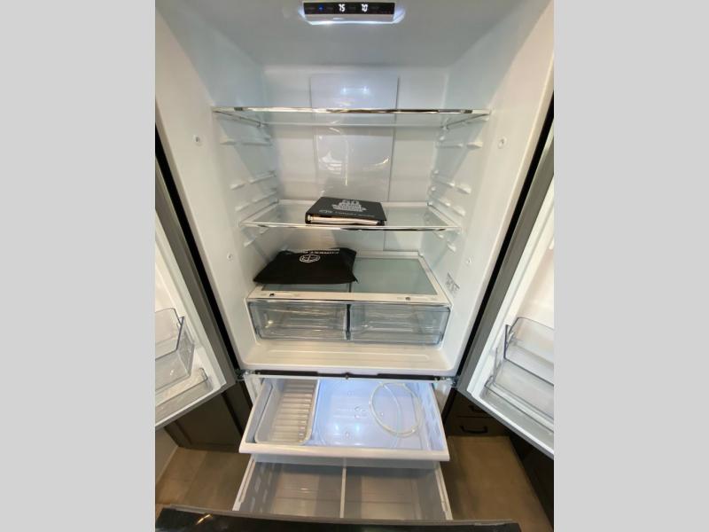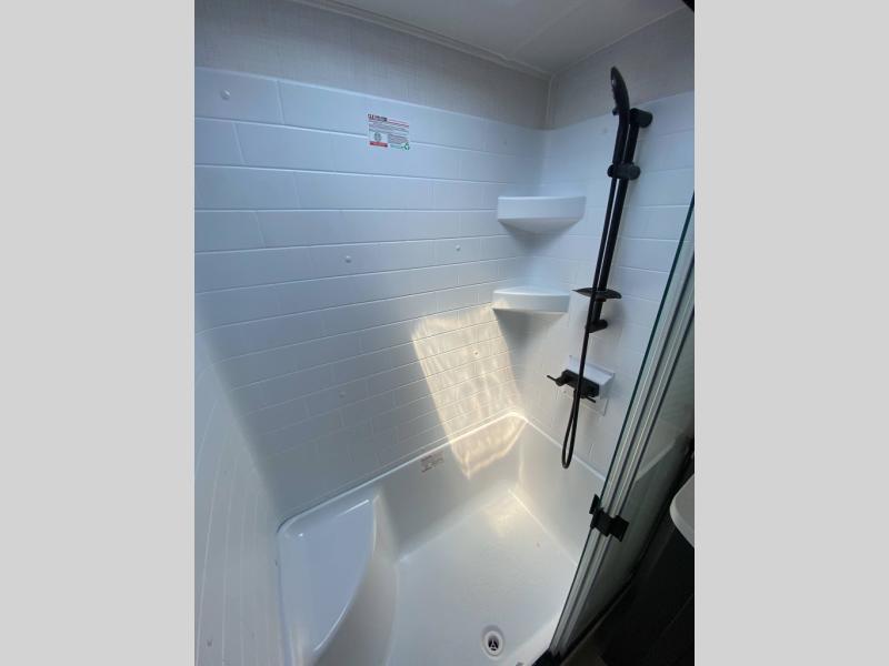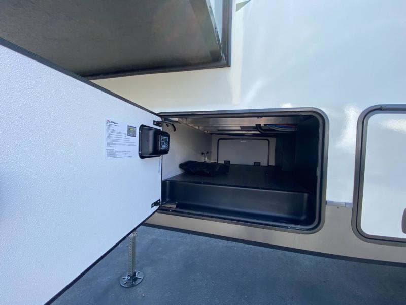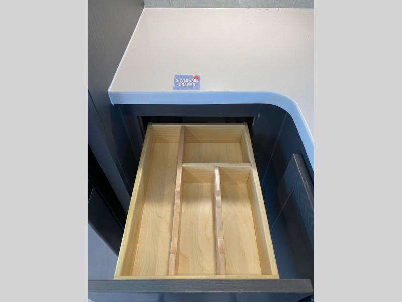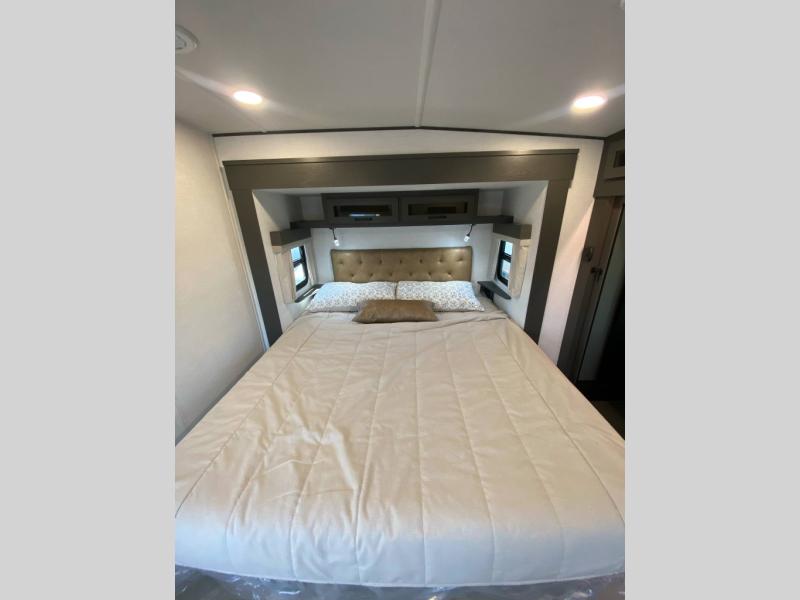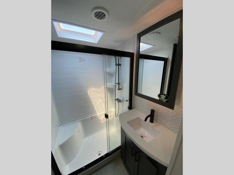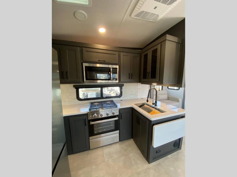 This fifth wheel has everything and then some! The front private bedroom has a queen bed slide with an optional king bed that can replace it and a front wardrobe with washer and dryer prep. Freshen up each morning in the full bathroom featuring a shower with a seat then head to the rear kitchen and scramble up some eggs on the three burner cooktop. You can enjoy your morning coffee and eggs at the 39" dinette. In the middle living area there is a 60" theater seat across from an entertainment center with a fireplace and opposing hide-a-bed sofa slides. You can even a cook outside on the outdoor griddle underneath the 11' awning! There is a second 13' awning over the Solid Step entry and pass-thru storage area.