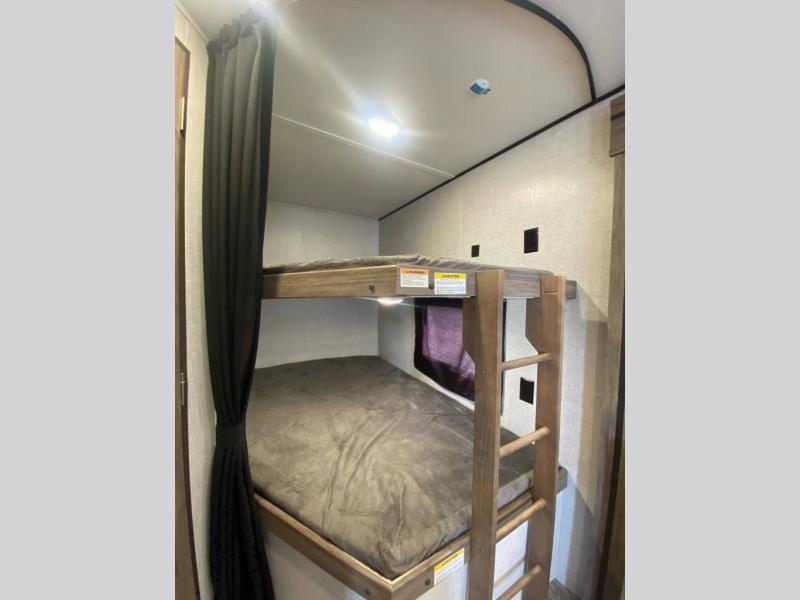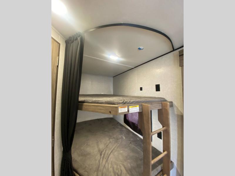 Pack up the kids and invite the cousins and grandparents for a fun camping trip in this Zinger Lite travel trailer. Or make it a friends camping trip with sleeping space for ten people in this unit with the addition of the bunk beds. Slide out the U-shaped dinette and the jackknife sofa to give extra space to the living and kitchen area. This model features full bath and kitchen amenities making your camping trip that much easier. You will enjoy the front private bedroom that includes an RV queen bed, plus two shirt closets. This travel trailer also includes a pantry for all your dry goods, overhead compartments for books and knickknacks, and an entertainment center.