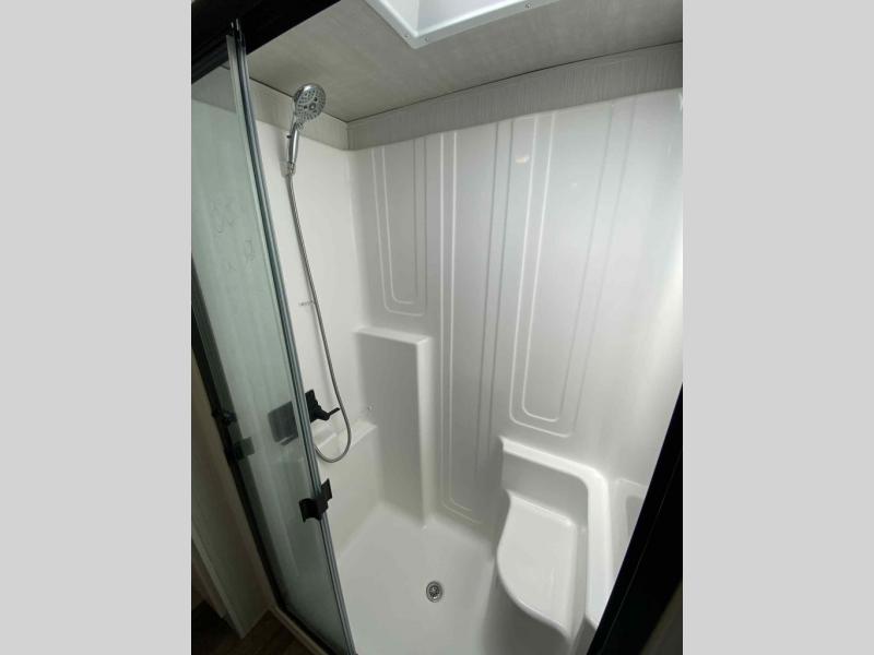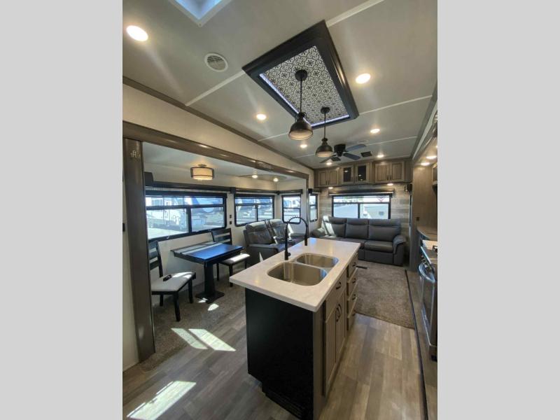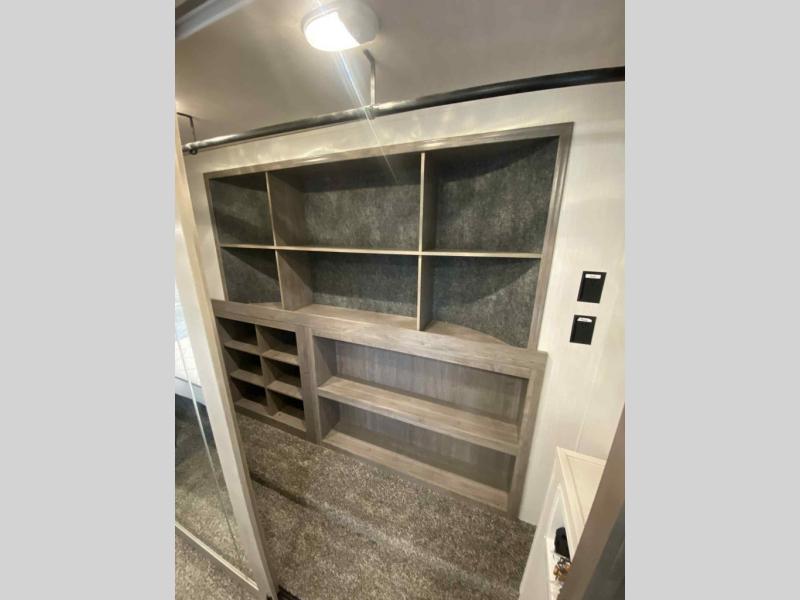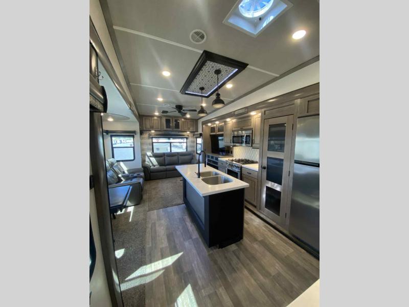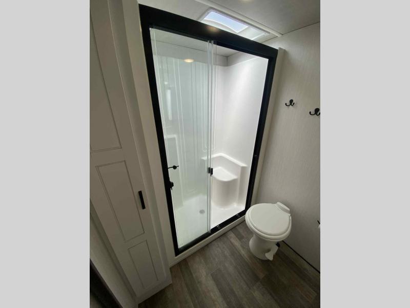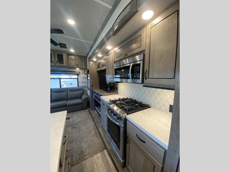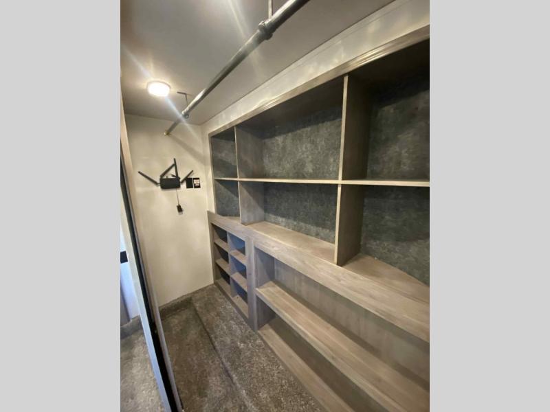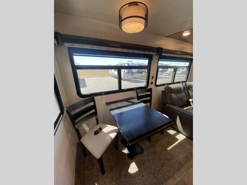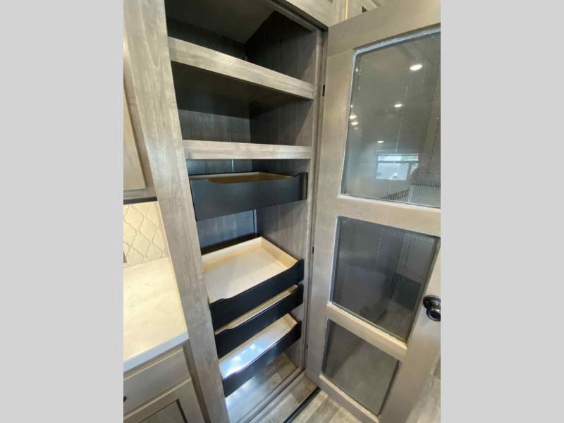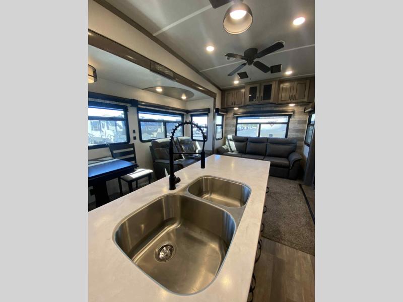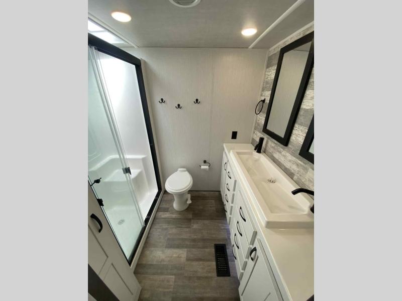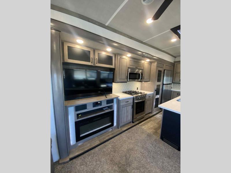 Do you wish to escape the mundane lifestyle? Well then, pick your favorite campsite and hitch up this Cedar Creek fifth wheel! The rear living area has a hide-a-bed sofa for you to bring an extra guest or two and power theater seating across from the entertainment center with a fireplace. The kitchen island will make your meal prep easy, and if you add the optional dishwasher, then you will have an even easier clean up. The large kitchen pantry is big enough to store your favorite snacks, and the free-standing table is a great place to enjoy your meals. Just outside the full bathroom is a closet to use as you wish, and inside is a shower with a seat, a linen closet, and a large sink with two faucets. You can even choose to add the optional exterior pull-out kitchen to breathe in some fresh air while grilling up some burgers!