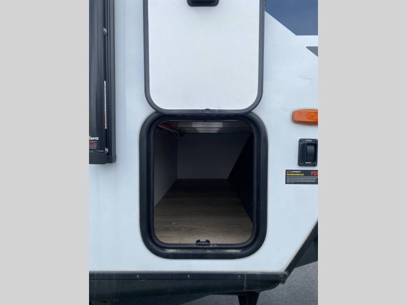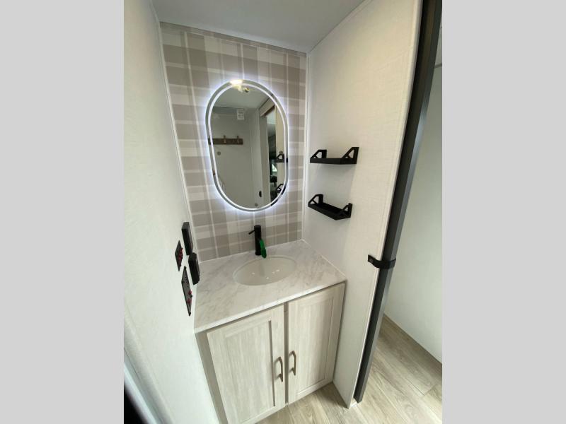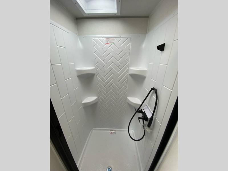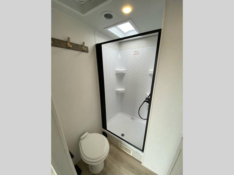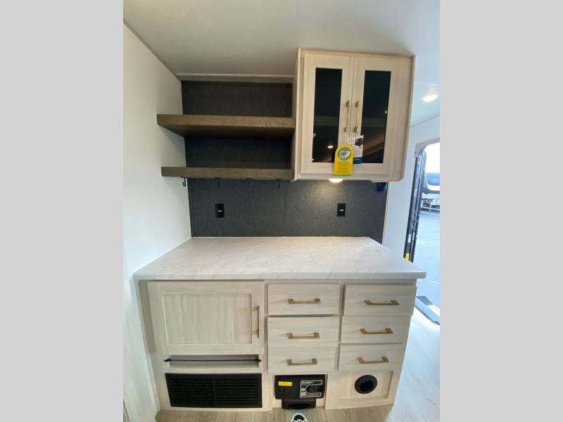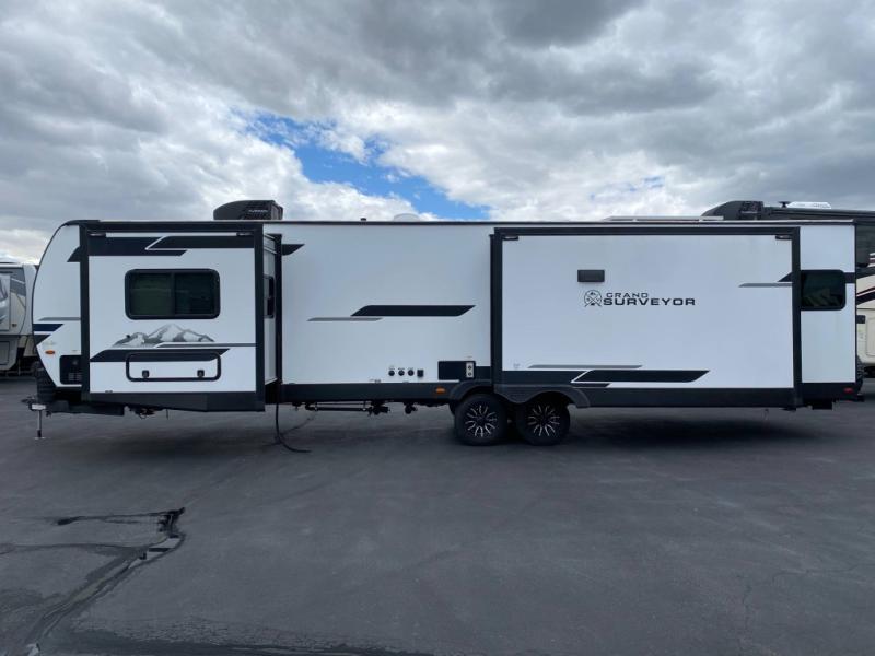 With any Grand Surveyor travel trailer by Forest River you will enjoy turn-key ready-to-go features and quality construction! Each model includes Azdel composite walls and a gel coated fiberglass front cap with an automotive style tinted windshield for a sleek look. There are friction hinge black glass entry door(s), an adjustable platform step with a night light, plus Goodyear tires and a power tongue jack for easy towing. The interior will have you feeling right at home with roller shades, residential faucets, sinks, and bathroom vanity, plus Surf(x) seamless countertops throughout. You can also plan for adventure with a 2" rear accessory and exterior spray port, and there are slam latch exterior baggage doors throughout to keep all your gear secure. Other stand-out features include a central vacuum system, a 200 watt solar panel with a 30 amp controller, a tankless water heater, carpet-free interiors, and the list goes on!