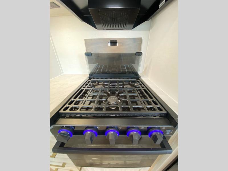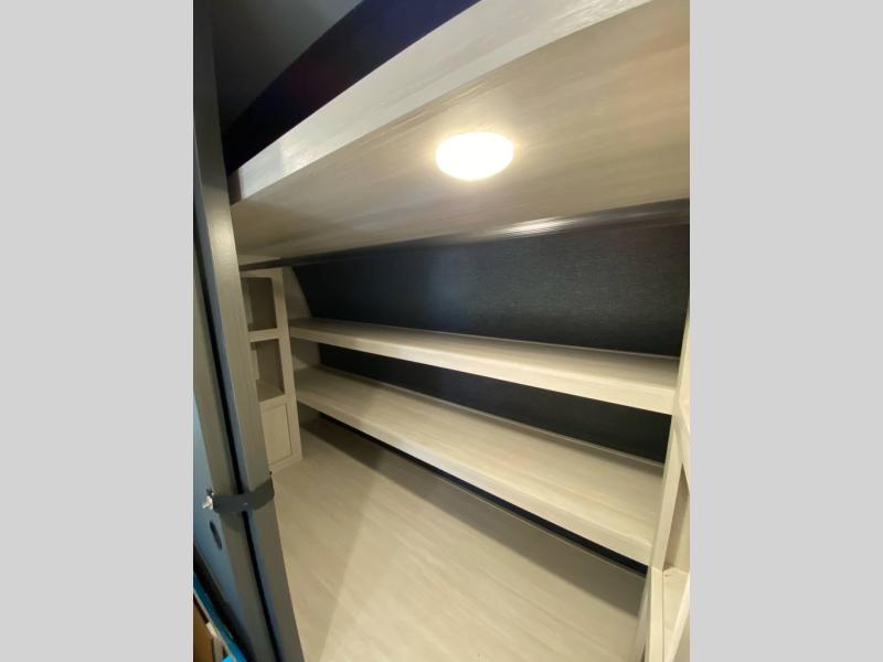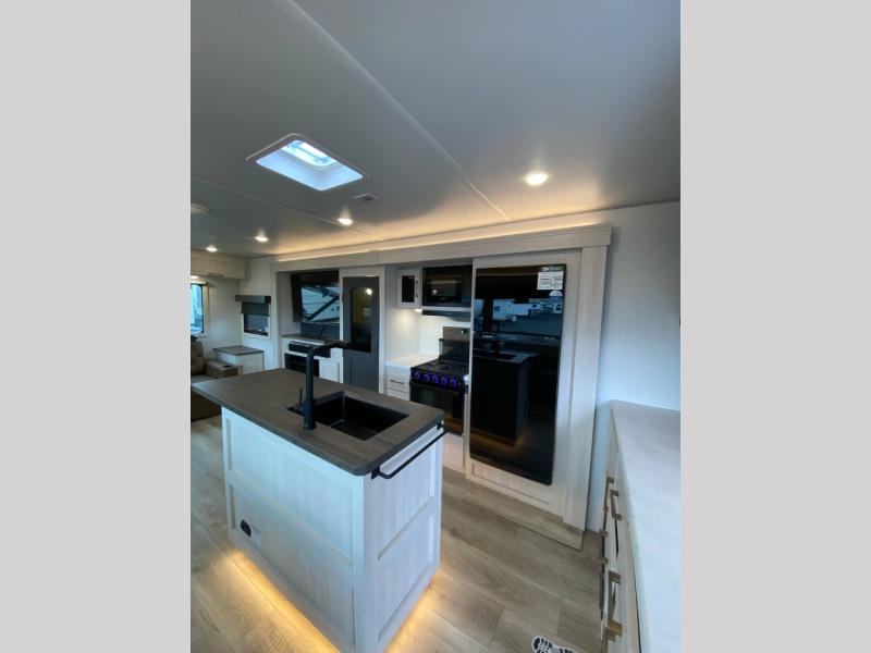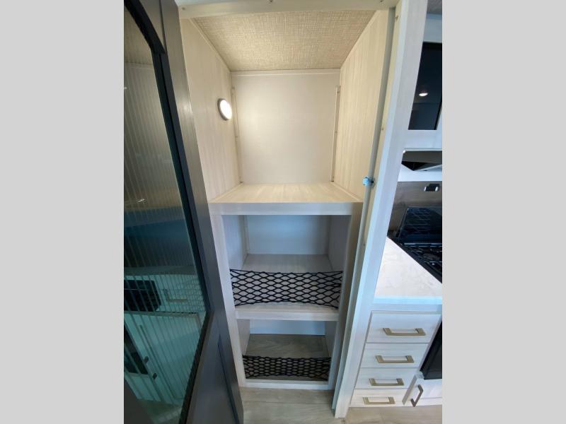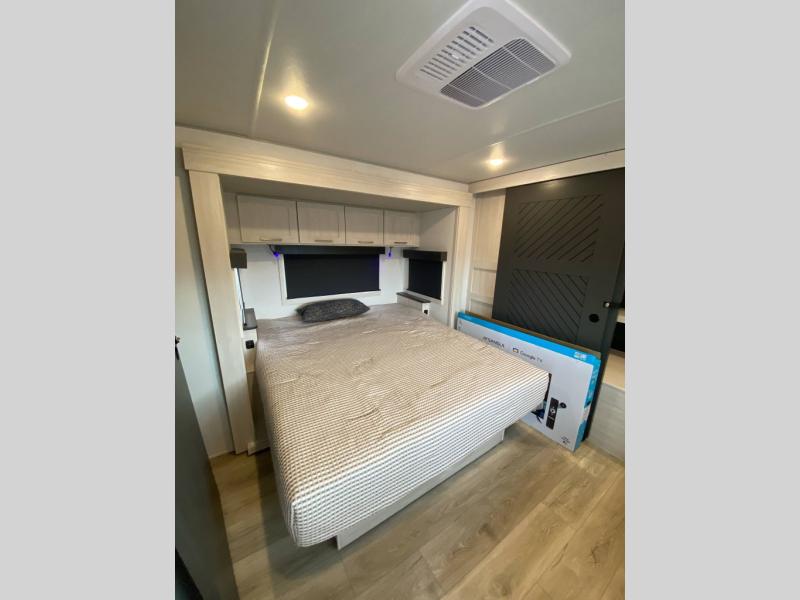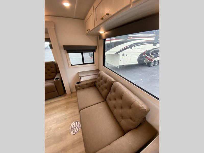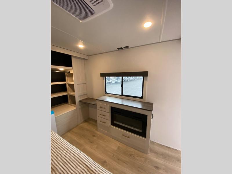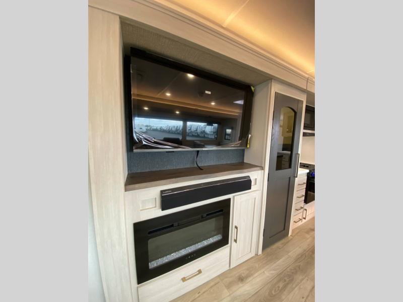 If luxury is what you're looking for, you won't have to search far with this travel trailer! There are triple slides, with dual opposing slides in the main living area for maximum space. The kitchen island gives a more residential feel to this space, plus there is a pantry, a hutch with shelves, a 10 cu. ft. 12V black glass refrigerator, and more kitchen features you are sure to love. The rear living area includes a tri-fold sofa to provide sleeping space for two overnight guests, and there is a theater seat across from the fireplace and HD TV. You'll also enjoy dining at the free-standing dinette with a multi-purpose ottoman! When it's time to call it a night, you can clean up in the spacious full bath, then head to the front master bedroom to retire. There is a custom king bed slide out here, along with a full-wall wardrobe in front, a dresser, a closet with washer and dryer prep, plus a bedroom fireplace!