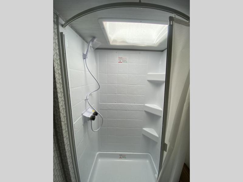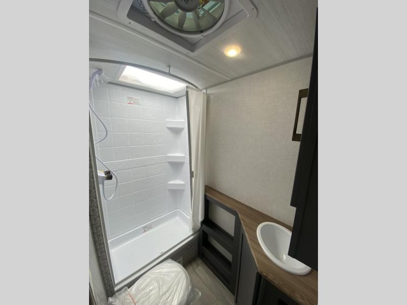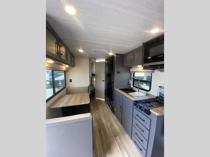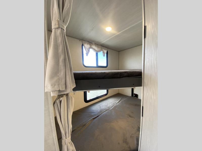 Start camping every chance you get with this easy-to-tow trailer! Once at camp, you can head out to explore to return to a versatile front area that offers a sofa during the daytime and a Murphy bed at night. There is a dinette for two to dine at as well as one to sleep on if needed, plus the galley kitchen provides the cook everything they need to feed one to several. There is a pantry for storage as well. The 44" x 74" double-size bunks will sleep two and maybe four kiddos, and the full bathroom will keep everyone refreshed. There is a pass-through compartment for the larger items like fishing poles and outdoor tables and a patio awning for some sun protection.