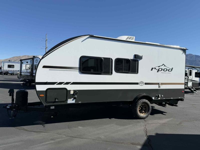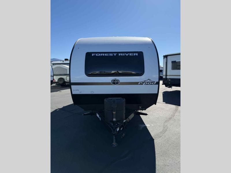 With any R-Pod travel trailer by Forest River, you will enjoy affordable luxury at the lowest tow weight in its class! There is a sealed underbelly with forced heat, a curved dual-pane acrylic front window with a bug screen and night shade, plus a large roof mounted solar panel for off-grid capabilities. The 15K A/C unit will keep you comfortable during the summer camping months, and the tankless water heater will provide endless hot showers after hiking, biking, swimming and more! Each model also includes a black glass friction hinge entrance door, roof ladder prep, exterior motion lighting, plus a hot and cold exterior spray port to wash off sand from the beach. Inside, you'll enjoy seamless Surf-X kitchen countertops, blackout roller shades, and a central vacuum system for hassle-free cleaning!
