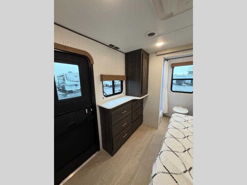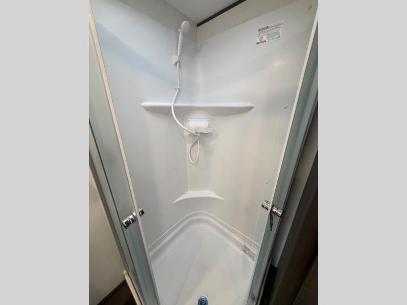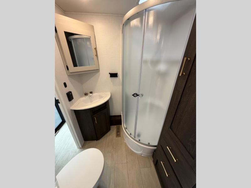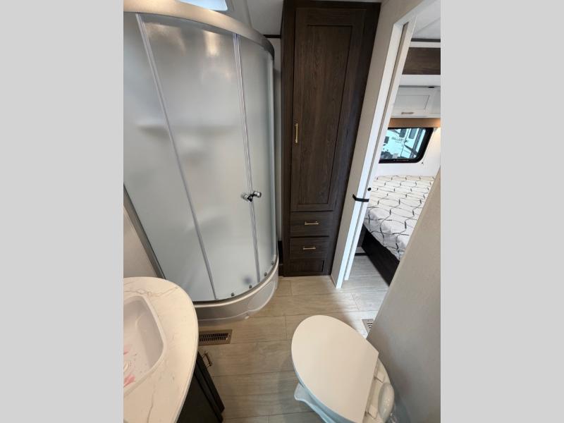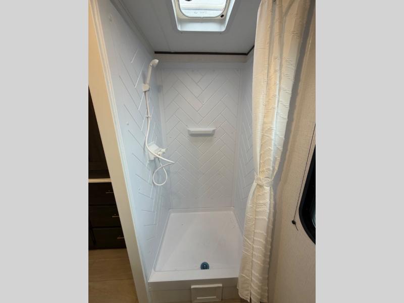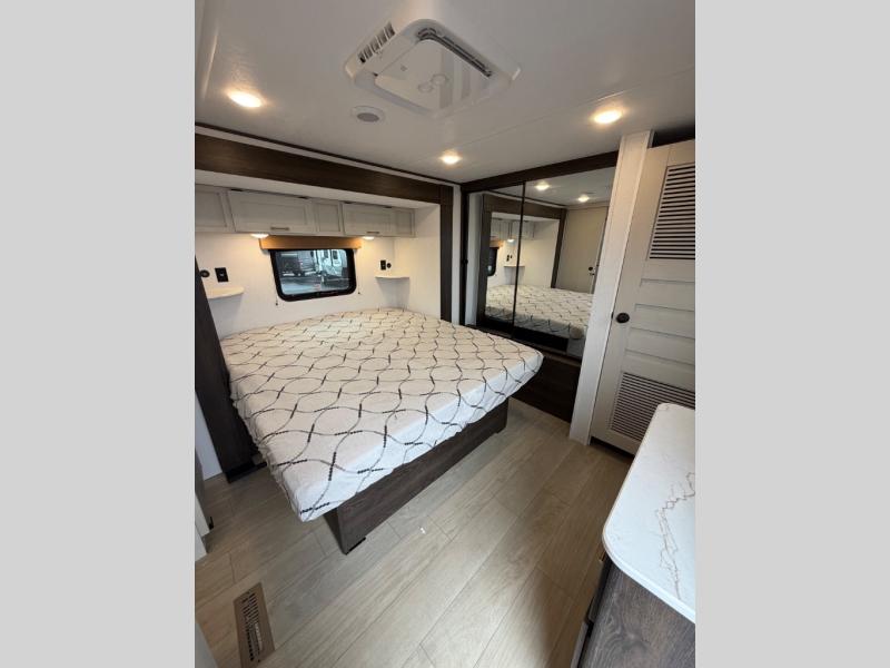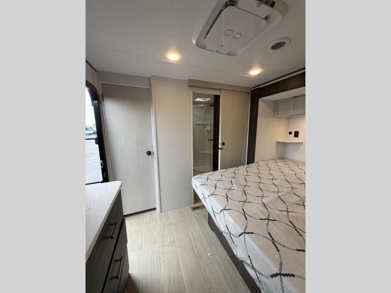 A rear bedroom with a queen bed and its own full bathroom.
