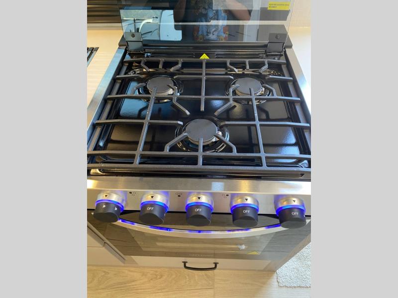 This floorplan offers a front Murphy bed that easily folds away to reveal a cozy sofa, opening up your living space during the day. A slide-out with a full dinette gives you added room to relax or work, and the fully equipped kitchen includes a 3-burner cooktop, microwave, and double-door fridge. The spacious rear bathroom provides a full shower, linen storage, and wardrobe space.