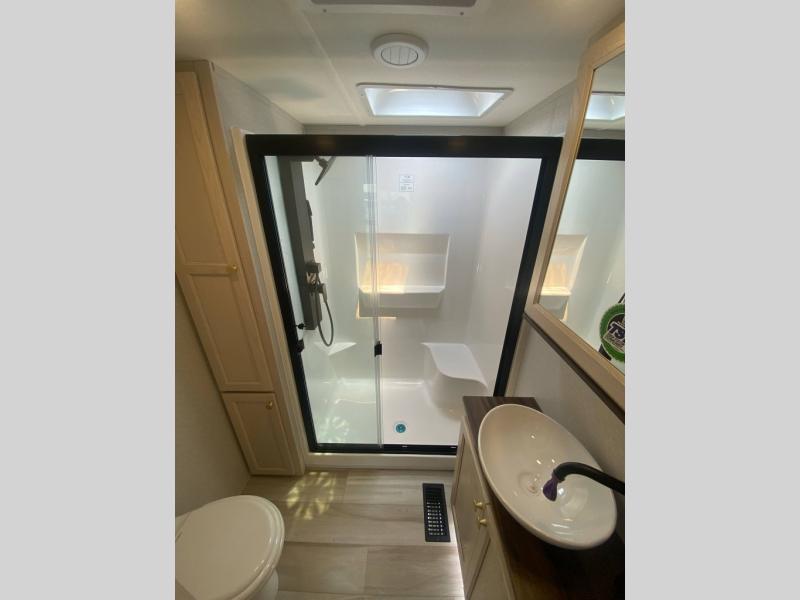 With any Cedar Creek Experience fifth wheel by Forest River, you will bet met with luxury features both inside and out! The True Gelcoat exterior is the best of the best in exteriors and the 3M bonded sidewalls will hold up over years of use. There is also a new 101'' wide-body frame, a Road Warrior suspension, plus a TST tire pressure monitoring system to make towing that much easier. You will find a hidden front storage compartment, along with a 4' x 6' ABS, ribbed, removable underbelly panels, and 6-point hydraulic leveling system, plus many more exterior conveniences. The interior will have you feeling like you haven't left home with vinyl floor coverings, power theater seating with USB ports, a cozy fireplace, vinyl floor covering and the list of comforts goes on! Each model is also pre-wired for satellite to the roof, and you're sure to never go bored with a Smart TV in the bedroom!