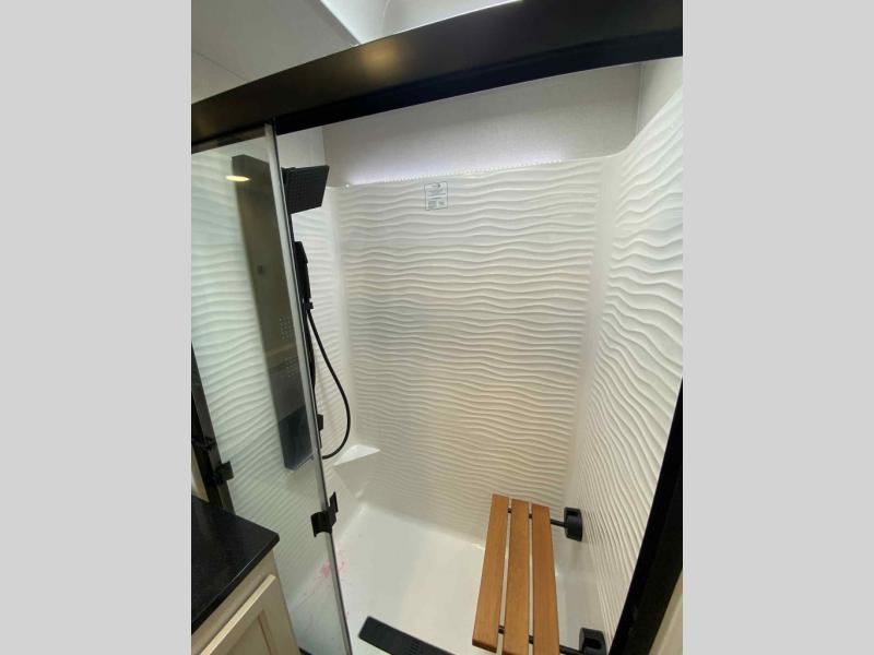- Redesigned 48" x 30" Rectangle shower with seat, sliding glass doors, and an upgraded shower head