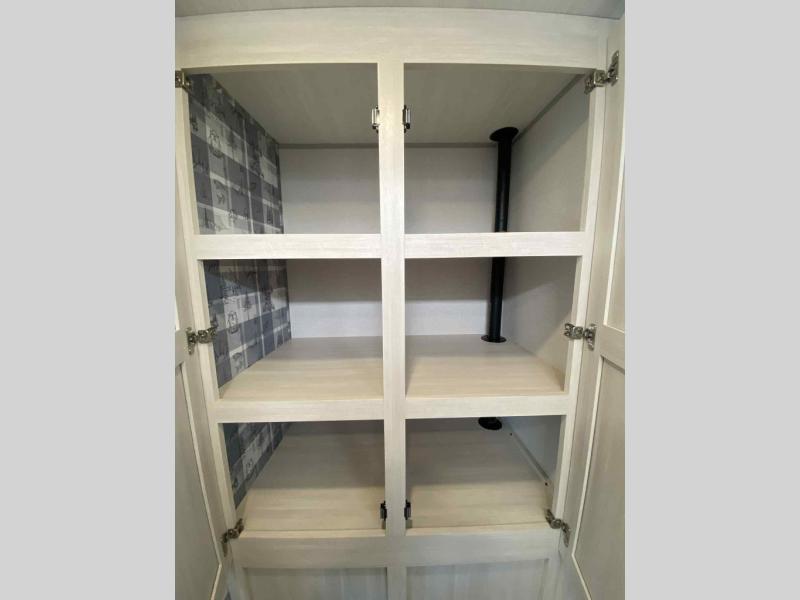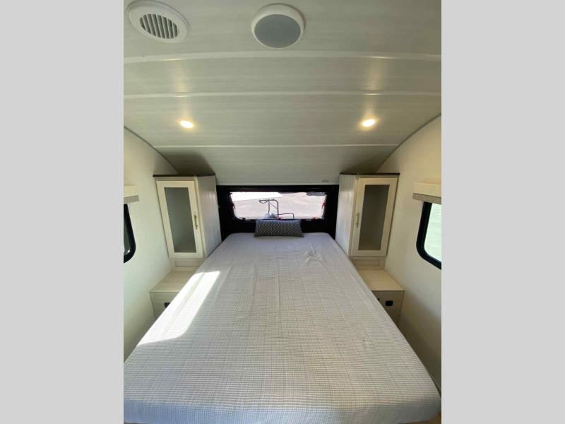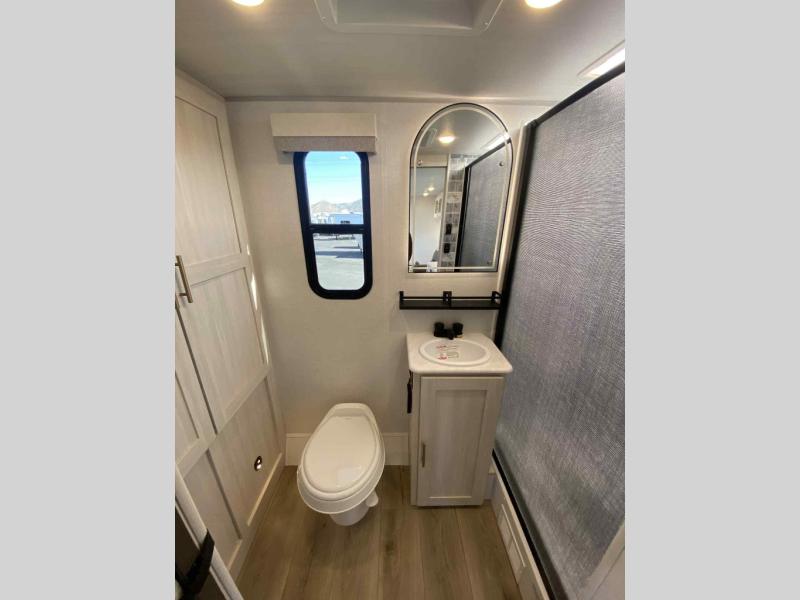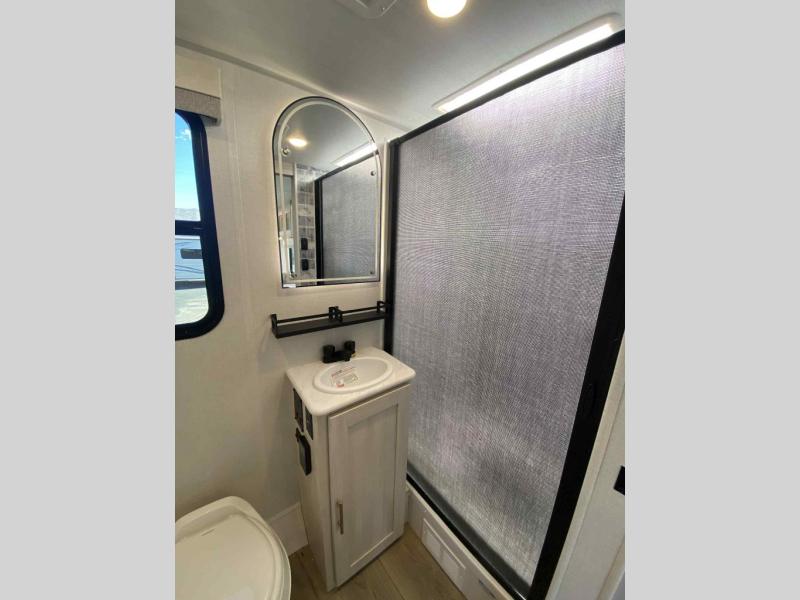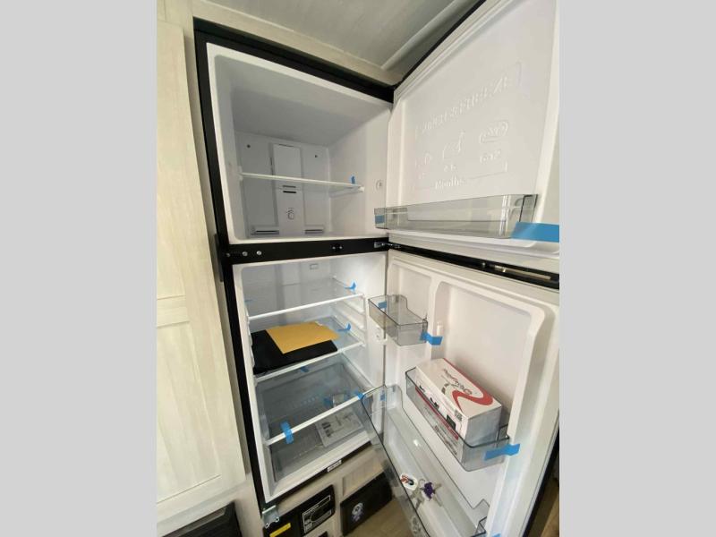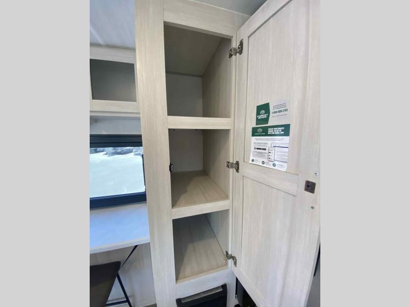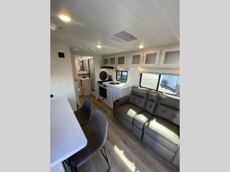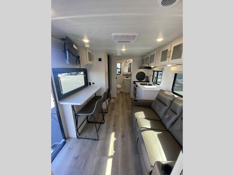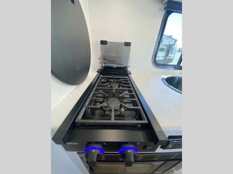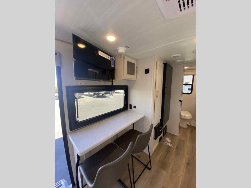 A front private bedroom with a walk-around queen bed, a full rear bath, and a theater seat are a few of the features that you are sure to want in your next RV! You can rest comfortably each night, plus all your clothing can be stored in the dual wardrobes to keep everything tidy. If you're needing more sleeping space, just choose the optional tri-fold sofa in place of the theater seat! The chef of your group can make meals on the two burner cooktop or in the air fryer/microwave, and there is a refrigerator for perishables. And the bar top with two seats and the flip-up window provide a great view outdoors as you dine together.