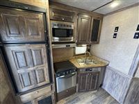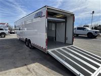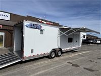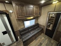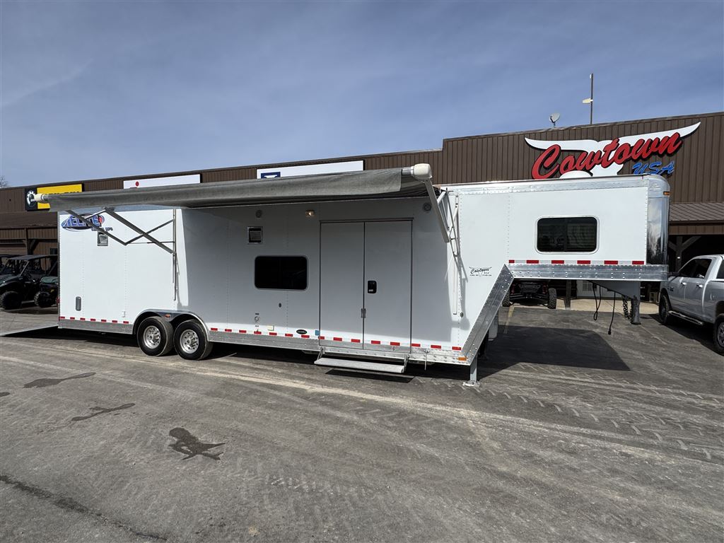 Available at Cowtown USA, this unique Elite Toy Hauler comes equipped with an approximately 14' Garage with 13' of parking space and an additional bed, a 13' Sierra Conversions custom living quarters, and all in an 8' wide, 8' Tall trailer. This toy hauler trailer measures in with an approximately 28' Floor length and 6'6" Width between the fenders in the garage. 573.885.6300
